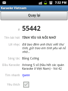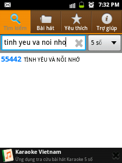 Tra cứu nhanh các bài hát trong các phòng Karaoke 5 số (Vol 1 -44) và dàn 6 số.Ngoài tính năng tìm kiếm bài hát theo tiêu đề, bạn có thể tìm theo mã bài hát và tên tác giả. Ứng dụng còn cho phép lưu lại bài hát vào danh sách yêu thích.